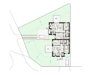 -A kis forgalmú utcában épülő ikerház egy 617m2-es saroktelekre épül. Önálló bejárattal kerül átadásra mindkét lakórész, nincs közös telekrész. Az alaprajzon látható „A” jelű ikerházi lakáshoz 293m2 telek tartozik.