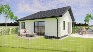 -A ház tervezésénél praktikus belső elrendezést vették figyelembe. A belső elosztás ideális, élhető alapterületen minden szükséges megtalálható. A földszintes ház 61.57m2 lakóterületű, helyiségei: nappali-étkező-konyha, 2 hálószoba, továbbá fürdő, önálló wc, előtér, háztartási helyiség ahol a mosógép és a hőszivattyú is elfér és egy közlekedő ahonnan a helyiségek nyílnak.