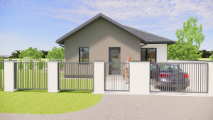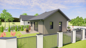 -A ház tervezésénél praktikus belső elrendezést vették figyelembe. A belső elosztás ideális, élhető alapterületen minden szükséges megtalálható. A földszintes ház 68.45m2 lakóterületű, helyiségei: nappali-étkező-konyha, 2 hálószoba, továbbá fürdő, önálló wc, előtér, háztartási helyiség ahol a mosógép és a hőszivattyú is elfér és egy közlekedő ahonnan a helyiségek nyílnak.