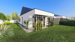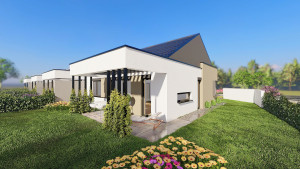 -A ház formája modern, letisztult stílusú tervezés eredménye. A belső elosztás is rendkívül ideális. A földszintes házban megtalálható a nappali-étkező-konyha mellett, három hálószoba, továbbá fürdő wc-vel, egy önálló wc, háztartási helyiség, közlekedő és egy tágas előszoba is.