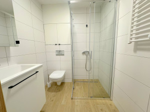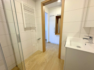 -Praktikusan kialakított belső elrendezés jellemző a lakásra, fürdőben épített zuhanyzó található üveg kabinnal. A mosdó alatt és a tükör mögött is van tárolóhely. Elsősorban felültöltős vagy keskeny elöltöltős mosógép fér el a fürdőben.