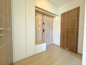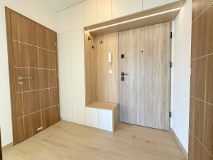 - A lakás előszobájában szintén mennyezetig érő beépített szekrény készült cipős és akasztós résszel, még a bejárati ajtó fölé is került pakolós szekrény.