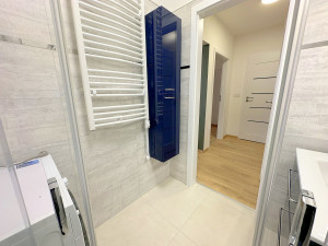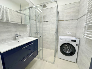 -A fürdőszobában zuhanykabin, elöltöltős mosógép, tárolásra alkalmas szekrények kerültek.