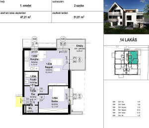 -A lakás elosztása: nappali+konyha, hálószoba, fürdőszoba, wc, előszoba, erkély.