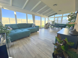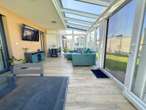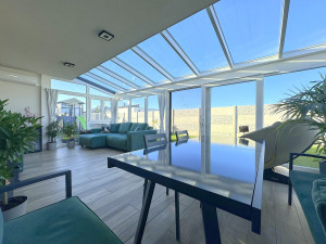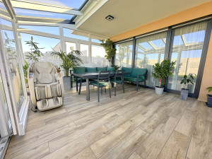 -A jó méretű nappali-étkező-konyha világos, közvetlenül kapcsolódik a télikerthez. A 3 hálószoba is jól méretű. Továbbá 2 db fürdőszoba (egyik wc-vel), vendég wc, kamra, háztartási helyiség, gardrób, előszoba és közlekedő helyiségek vannak.