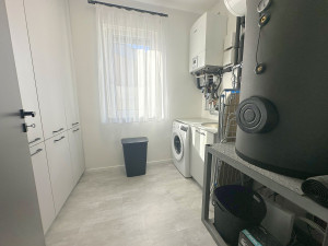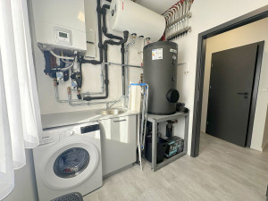 -Bosch hőszivattyú, padlófűtés + födémhűtés. Szobákban, nappaliban és a télikertben külön termosztáttal egyedileg beállítható hőmérséklettel. A födémhűtés maximális komfortot biztosít a meleg napokban is. A télikertben egy inverteres klíma (hűtő-fűtő) is felszerelésre került